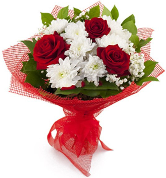 1 красные роза, 2 белые хризантемы, зелень, упаковка, лента3 красные розы, 3 белые хризантемы, зелень, упаковка, лента5 красных роз, 4 белые хризантемы, зелень, упаковка, лента